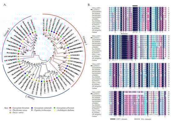 The alignment results of the Gh_A07G0747 (GhTOM) protein with other TOM-GPCR from other plants, Cotton_A_24028.1, Gorai.001G092500.1, Thecc1EG002003, Potri.005G203600.1, Potri.002G058500.1, AT3G59090.2, Thecc1EG029520, Gorai.011G042100.1, Gh_D10G0373.1, Cotton_A_17563.1, Gh_A10G0365.1, and LOC_Os01g54784.1 obtained from Gossypium raimondii (Gorai…), Theobroma cacao (Thecc…), Oryza sativa (LOC…), Arabidopsis thaliana (AT…), and Populus trichocarpa (Potri…) exhibited high similarities ranging from 52% to 100%. The aligned sequences revealed two types of functional domain which have never been described in any literature (“GWT” and “FLL”), with most of them exhibiting the C-terminal domain (Figure 2B). The detection of the C-terminal domain is in agreement with earlier descriptions of GPCRs by Tuteja, [55], who stated that some GPCRs contain a cysteine residue in the C-terminal domain which serves as the main site for palmitoylation, mainly referring to site for lipid modification.