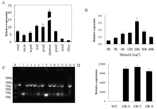 In order to confirm whether the transformed gene in Arabidopsis is present in cotton tissues, we carried out the qRT-PCR analysis of the expression of the gene using RNA samples extracted from different tissues of cotton plant under normal conditions. We found that the gene was more abundantly expressed in the stamen and leaves compared to other tissues analysed (Figure 3). In addition, we carried out treatment on cotton seedlings after the emergence of three true leaves under high salt stress condition (300 mM NaCl); leaf samples were collected for RNA extraction at intervals of 0 h, 3 h, 6 h, 12 h, 24 h, 36 h, and 48 h. A steady increase from 0 h to 24 h followed by a steady decline in gene expression was observed in salt-treated plants.