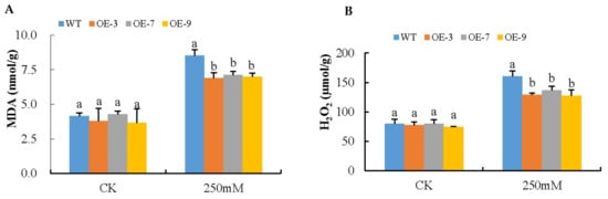 Changes of malondialdehyde (MDA) and H2O2 in Gh_A07G0747 (GhTOM) transgenic lines under salt stress. (A) Determination of MDA accumulation in leaves of wild-type (WT) and both overexpressed (OE) lines (OE-3, OE-7, and OE-9) after 8-day salt stress; (B) Quantitative determination of H2O2 accumulation in leaves of WT and both OE lines (OE-3, OE-7, and OE-9) after 8-day salt stress. In (A,B), each experiment was repeated three times. Bar indicates standard error (SE). Different letters indicate significant differences between wild-type and OE lines (ANOVA; p < 0.05). CK: normal conditions.