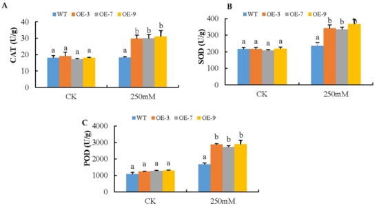 Activities of antioxidant enzymes catalase (CAT), superoxide dismutase (SOD), and peroxidase (POD) in WT and Gh_A07G0747 (GhTOM)—transgenic lines. Four weeks old WT and transgenic plants were salt-stressed for 8 days and then the leaf samples were taken and used to detect activities of CAT, SOD and POD. (A) CAT activity; (B) SOD activity; (C) POD activity. Data are means ± SE calculated from three replicates. Different letters indicate a significant difference between the WT and both transgenic lines (ANOVA; p < 0.05). Three independent experiments were carried out and the results were similar.