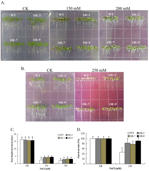 The three transgenic lines—overexpressed lines 3, 7, and 9, designated as OE-3, OE-7, and OE-9—were monitored for NaCl stress tolerance by first growing seedlings in vertical position in 0.5 MS for 5 days and then transferring to the new plates with 0.5 MS containing 0 mM NaCl, 150 mM, NaCl, and 200 mM NaCl concentrations; they were grown for 6 days. The root length was recorded on the seventh day post-transfer. Survival assay was carried out by using seeds from WT and Gh_A07G0747 (GhTOM) transgenic lines, sown in 0.5 MS for 5 days and then transferred to the new plates containing 0 mM and 250 mM NaCl concentrations. The plants’ survival rates were examined at the fourth day of germination.