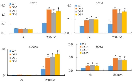 Expression levels of salt stress-responsive genes (CBL1, ABF4, RD29A, and SOS2) in wild-type and transgenic lines. Arabidopsis ACTIN2 was used as the reference gene, mean values with ± SD. * p < 0.05 as calculated by Student’s t-test.