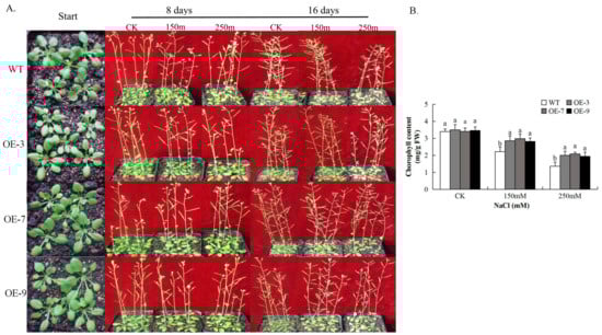 Phenotypes of wild-type (WT) and Gh_A07G0747 (GhTOM)-transgenic Arabidopsis plants in response to salt stress. (A) Salt tolerance of potted plants of wild-type and Gh_A07G0747 (GhTOM)—OE Arabidopsis. Four-week-old WT and transgenic OE (OE-3, OE-7, and OE-9) plants were grown in soil in pots for 8 and 16 days under salt stress; (B) Chlorophyll determination between the wild-type and the transgenic lines after 8 days of salt stress. Values are mean ± SE, n = 12, and significant differences between wild-type and OE lines are indicated by different letters.