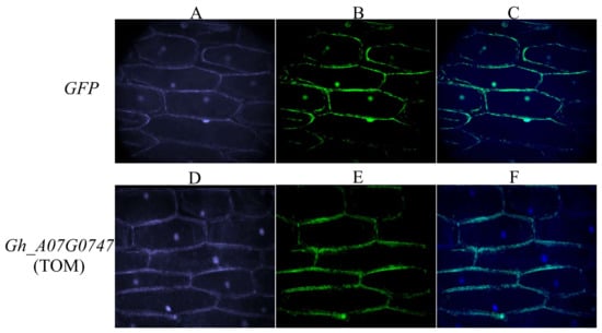 Localization of Gh_A07G0747 (GhTOM) in onion epidermal cells. (A–C) Onion epidermal cells transformed with 35S::GFP; (D–F) Onion epidermal cells transformed with 35S::GFP–Gh_A07G0747 (GhTOM). (A,D) Light field with magnification of X400 to display morphology. (B,E) Dark field images for the detection of green fluorescent protein (GFP) fluorescence. (C,F) Superimposed light and dark field images.