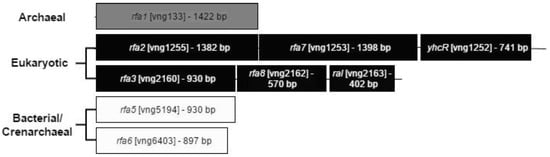 The extremely radiation- and UV-resistant model halophile Halobacterium salinarum provides a unique system for the study of the individual roles of multiple SSB/RPA proteins. In radiation-resistant mutants of Hbt. salinarum, one of the two eukaryotic-like operons present on the main chromosome was constitutively upregulated [,]. The three genes, rfa3, rfa8, and ral, were shown to be co-transcribed, and recent evidence has suggested that at least the Rfa3 and Rfa8 proteins interact in the cell []. Additional expression of this operon on a plasmid conferred increased radiation resistance, indicating that increased levels of these proteins are sufficient to increase resistance [].