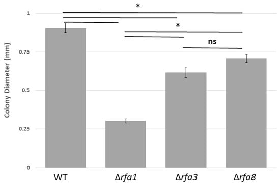Colony size comparison between LH101 (wild-type: WT) and LH140 (Δrfa1), LH134 (Δrfa3), and LH136 (Δrfa8). Plates were incubated for 7 days. Colony diameter was measured using ImageJ (Version 1.8.0_112, National Institutes of Health, Bethesda, MD, USA) []. * p < 0.05, analysis of variance (ANOVA) with Tukey’s Honest Significant Difference (HSD), n = 22–40 colonies total over 2 biological replicates. Error bars represent the standard error of the mean (SEM). ns = not significant.