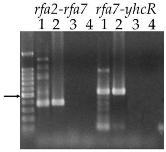 Co-transcription of rfa2, rfa7 and yhcR. Primers bracketing the intergenic regions rfa2-rfa7 and rfa7-yhcR were used in reactions with different templates. Lane 1: cDNA; Lane 2: genomic DNA; Lane 3: total RNA; Lane 4: no template. Size marker is 1 kb PLUS DNA ladder (Gold Biotechnology, St. Louis, MO, USA). Arrow indicates 500 bp.