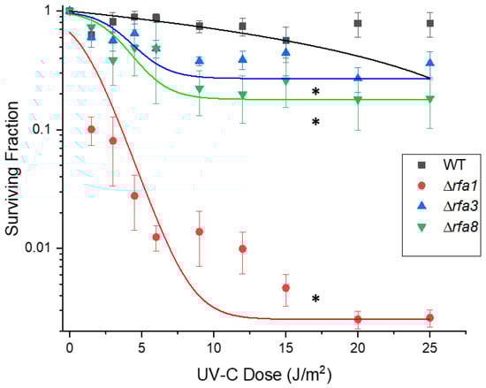Survival of Hbt. salinarum deletion strains to UV-C damage. LH101 (WT), LH140 (Δrfa1), LH134 (Δrfa3), and LH136 (Δrfa8). * p < 0.05 compared to LH101; ANOVA with Tukey’s HSD, n = 3. Error bars represent +/− standard error of the mean. Mutant strain survival curves were fitted to the Boltzmann function in Origin 2018 (OriginLab, Northampton, MA, USA).