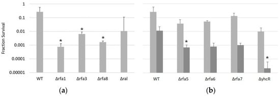 3.3.3. Δrfa5, Δrfa6, Δrfa7, and ΔyhcR Strains Are Also Sensitive to Mitomycin C