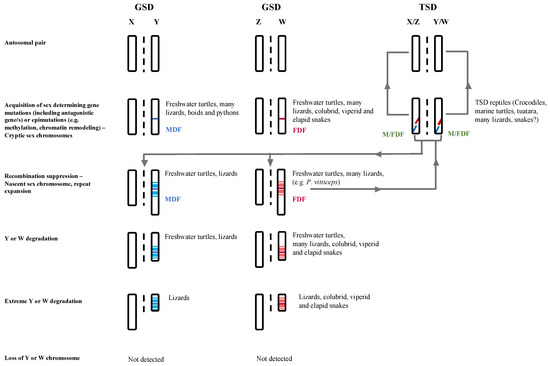 Proposed model for lizard sex chromosome evolution, modified from [11]. Many Reptiles are likely to have followed the currently held view of sex chromosome evolution as proposed for vertebrates but may also involve other regulatory molecular mechanisms (e.g., epigenetic). The sex determination (sensu sex chromosomes) in genotypic sex determination (GSD) and temperature-dependent sex determination (TSD) with environment influence is bipotential and could involve polygenic or epigenetic mechanisms, hence retaining the homomorphic sex chromosomes and high diversities. MDF = Male determining factor, FDF = Female determining factor.