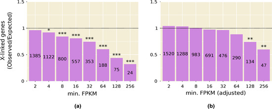 Underrepresentation of highly expressed, X-linked genes in the testis: (a) Using the reported expression values for all genes; (b) After multiplying the fragments per kilobase of transcript per million mapped reads (FPKM) of all X-linked genes by 1.53 to adjust for the absence of dosage compensation. The number of genes in each expression category (i.e., genes with FPKM greater than or equal to the value on the X-axis) is displayed within the bar. * p < 0.05; ** p < 0.01; *** p < 0.001.