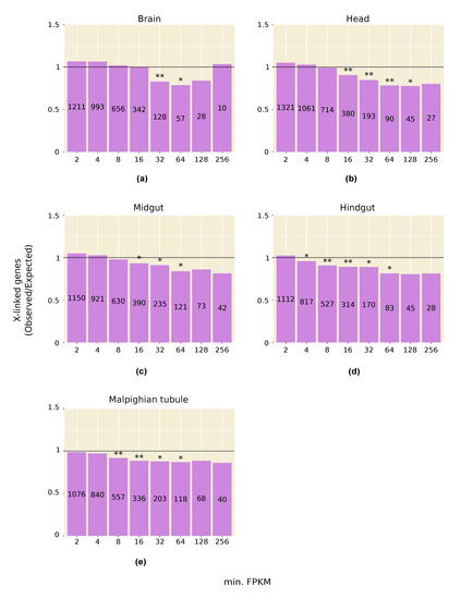 Representation of X-linked genes in male somatic tissues: (a) Brain; (b) Head; (c) Midgut; (d) Hindgut; (e) Malpighian tubule. The number of genes in each expression category (i.e., genes with FPKM greater than or equal to the value on the X-axis) is displayed within the bar. * p < 0.05; ** p < 0.01.