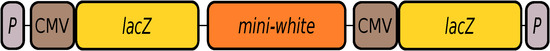 Schematic illustration of the reporter gene construct. The construct contains the mini-white marker gene and two copies of the lacZ reporter gene under control of the human cytomegalovirus (CMV) promoter. The terminal sequences of the P-element (P) represent the boundaries of the transgene. The CMV promoter is able to drive ubiquitous expression of the reporter gene in D. melanogaster.