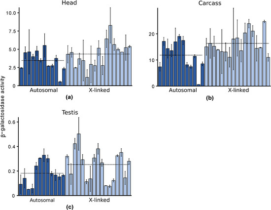 Autosomal and X-linked expression of a ubiquitously-expressed reporter gene in males: (a) Head; (b) Carcass; (c) Testis. Each bar represents a transformed line with the reporter gene inserted at a unique autosomal (dark blue) or X-linked (light blue) location. Expression was measured spectrophotometrically as β-galactosidase activity in units of mOD/min. Error bars indicate the standard deviation across biological replicates. Dotted lines indicate the average activities of all autosomal or X-linked lines.