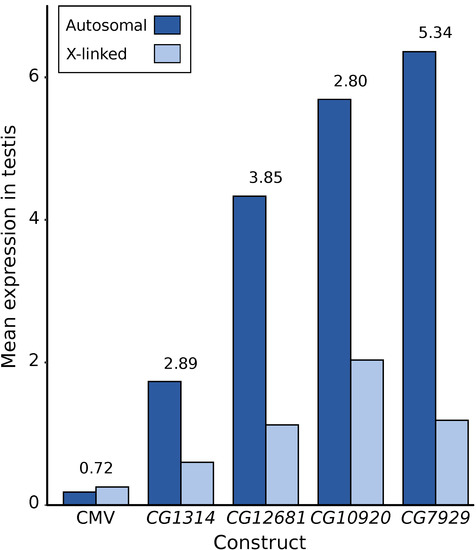 To investigate the expression of X-linked and autosomal genes on a genome-wide scale, we used data from FlyAtlas2 [25], which was constructed using RNA-seq data from multiple tissues of each sex. For the testis, we found that the expression of X-linked genes was significantly lower than autosomal genes (Table 1), with the median expression of X-linked genes being 65% that of autosomal genes. This result is consistent with the absence of X-chromosomal dosage compensation in the male germline [15,16]. Although, based on dosage levels alone, one might expect the X chromosome to have 50% of the expression of the autosomes, previous studies have found that, even in the absence of chromosome-wide dosage compensation, the expression of single-dose genes is approximately 65% that of genes present in two doses [15,16,31,32], presumably as the result of gene-specific buffering mechanisms.