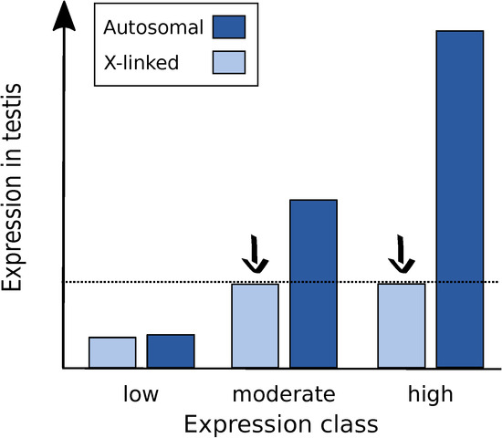 Proposed model for the regulation of the X chromosome in the male germline of D. melanogaster. X suppression (black arrows) affects genes that are expressed above a certain threshold (dashed line). Genes that have the potential for high expression on the autosomes, such as housekeeping and testis-specific genes, are suppressed when X-linked. The degree of X suppression is dependent on a gene’s autosomal expression class, with the highly expressed genes being more severely affected. Genes that have low expression are not affected by X suppression, as they do not reach the expression threshold.