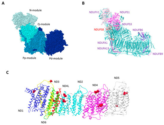 The mitochondrial oxidative phosphorylation (OXPHOS) system is the major site of energy production in eukaryotic cells and is composed of four respiratory complexes (complex I, II, III, and IV) and FoF1–adenosine triphosphate (ATP) synthase organized in functional supramolecular structures, such as dimers of single complexes or supercomplexes formed by the association of different complexes [1]. Among these enzymatic giants, respiratory complex I (CI) (also referred to as nicotinamide adenine dinucleotide (NADH): ubiquinone oxidoreductase/EC.1.6.5.3) is the largest, being composed of 44 subunits, seven of which (ND1–6 and ND4L) are encoded by mitochondrial DNA (mtDNA). The remaining 37 subunits are encoded by the nuclear DNA (nDNA), synthetized in the cytosol, and imported into the mitochondria where they associate with mtDNA-encoded subunits, form subcomplexes, and then assembly into the functional enzyme [2]. This process is mediated by several chaperones required for correct assembly but are dissociated from the mature complex and do not affect its function [3]. From a structural point of view, CI shows a slightly opened L-shape structure, in which two arms can be identified: the membrane embedded hydrophobic arm composed by both mtDNA- and nDNA-encoded subunits and the hydrophilic arm, exclusively composed by nDNA-encoded subunits, which protrudes into the mitochondrial matrix [4] (Figure 1A). Three functional modules can be clearly identified in the holoenzyme: (i) the hydrophilic NADH (N)-module oxidizes NADH, (ii) the hydrophilic quinone (Q)-module provides electron transfer through the Fe–S clusters to ubiquinone, and (iii) the hydrophobic membrane-embedded proton pumping (P)-module undergoes conformational changes to perform proton pumping in the mitochondrial intermembrane space [5]. The main function of CI is to couple proton translocation with electron transfer from NADH to ubiquinone, contributing to generation of the mitochondrial membrane electrochemical gradient, the driving force for ATP synthesis by FoF1–ATP synthase. As a byproduct of the electron transfer process, CI generates reactive oxygen species (ROS) having two sites accessible to O2 where formation of superoxide anion may occur, namely the NADH and the ubiquinone binding sites [6].