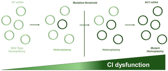 Since most CI mutations have been shown to occur in subunits encoded by the mtDNA, a thorough understanding of mitochondrial genetics, which substantially differs from the nuclear one, is necessary to comprehend the origin and functional consequences of such lesions in cancer cells. Human mtDNA is a double-stranded circular molecule of 16,569 bp encoding for 37 genes: 13 genes for respiratory complexes structural subunits and 22 tRNA and 2 rRNA necessary for translation of mitochondrial proteins. One of the peculiar feature of mtDNA is the extreme compact sequence organization. In fact, it lacks repetitive sequences, introns, or intergenic regions, presents with overlapping genes, and transfer RNA (tRNA) genes are used as the signal for cleavage sites of the polycistronic mRNA. The major regulatory non-coding region is the D-loop (displacement loop) which contains the replication origin for the H-strand and the site of transcription from opposing heavy and light strand promoters. A second non-coding region is composed by 30 nucleotides and encompasses the replication origin for the L-strand (reviewed in [16]). Mitochondrial genetics follows its specific rules and differs from Mendelian genetics in three major aspects [17]: (i) maternal inheritance—mitochondria in the zygote derive from the oocyte because after fecundation, all the mitochondria from the spermatocytes are degraded. Hence, mtDNA molecules and germ lines mutations are inherited along the maternal lineage; (ii) heteroplasmy and threshold effect (Figure 2)—mtDNA is polyploid, meaning that a mammalian cell can contain from hundreds to thousands copies of mtDNA. The condition of homoplasmy is reached when all the mtDNA molecules are identical (wild type or mutant), whereas heteroplasmy occurs when different mitogenomes coexist. As a general rule, heteroplasmic mtDNA mutations must trespass a critical load to express their phenotype (threshold effect). This threshold usually ranges between 70% and 90% of mutant mtDNA molecules, but depends of the mutation type and the energy requirements of the affected cell or tissue [18]; (iii) mitotic segregation—the replication of mtDNA and nDNA is not coordinated and the distribution of mitochondria during cell division is casual. For this reason, the mutation load can vary with time in somatic cells.