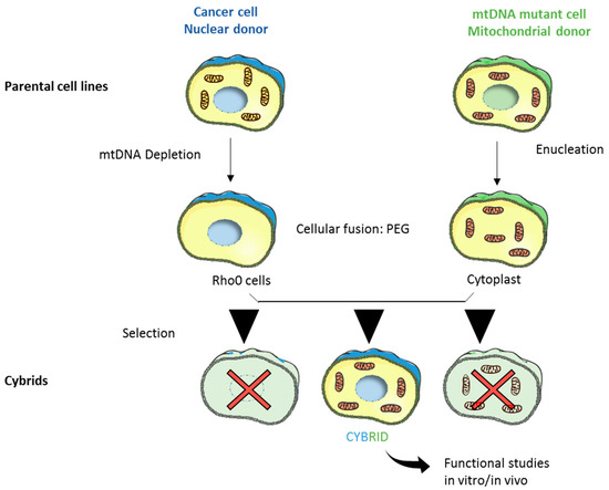 Transmitochondrial cytoplasmic hybrids (cybrids) generation. The original method was developed in Giuseppe Attardi’s laboratory [23] and allows study of the functional effects of mtDNA mutations in an isogenic nuclear background. This three-step technique is based on mitochondria transfer from an enucleated cell line (Rho0, mitochondrial donor) to another nucleated cell (cytoplast, nuclear donor). Cytoplasmic fusion of generated Rho0 cells and cytoplasts using polyethylene glycol (PEG) allows generation of cybrids that will be isolated after an appropriate selection step and used both in vitro and in vivo as cell models to evaluate the impact of mtDNA mutations. This figure has been created by modifying the templates of the empty cell and mitochondria from Servier Medical Art (https://smart.servier.com/smart_image/cell-24/; https://smart.servier.com/smart_image/mitochondria-16/).
