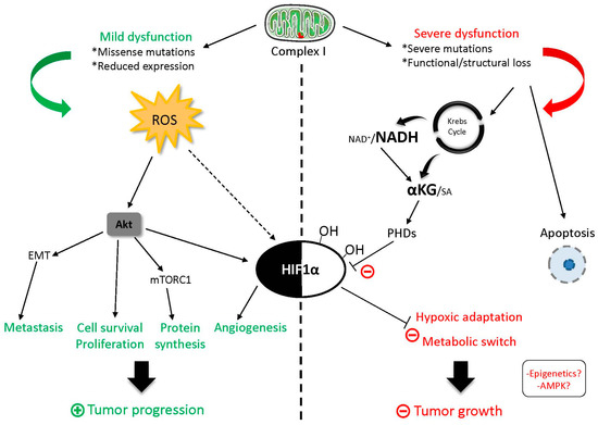 The oncojanus effect of CI encoding genes on tumorigenesis. Mild functional alterations of CI cause mitochondrial ROS overproduction and subsequent activation of the oncogenic Akt/mTORC1 (mammalian Target Of Rapamycin Complex 1) pathway that leads to cell proliferation and survival, epithelial–mesenchymal transition (EMT), and HIF1α stabilization, thus favoring tumor progression. Conversely, severe CI dysfunction provokes the accumulation of tricarboxylic acids (TCA) cycle products NADH and α-ketoglutarate (KG), which impedes Hypoxia Inducible Factor (HIF) 1α stabilization, hypoxic adaptation, ultimately arresting tumor growth. Moreover, the energetic crisis stimulates apoptotic cell death.