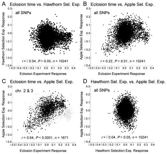 Relationships of the genomic responses of SNPs in the apple prewinter selection experiment (allele frequency difference between treatments, 7–32 days), hawthorn prewinter selection experiment (allele frequency difference between treatments, 7–32 days), and eclosion time GWAS (allele frequency difference between groups, early–late eclosing). (A) Eclosion time vs. hawthorn selection experiment for all 10,241 SNPs; (B) Eclosion time vs. apple selection experiment for all 10,241 SNPs; (C) Eclosion time vs. apple selection experiment for SNPs mapping to chromosomes 2 and 3; and (D) Hawthorn vs. apple selection experiment for all 10,241 SNPs. Note that for panel (C) the overall relationship for all 10,241 genotyped SNPs is depicted by light grey dots to highlight the subset of SNPs of interest in black for comparison in the graph.