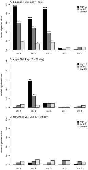 Percentages of SNPs displaying significant responses in each diapause experiment. (A) Eclosion time GWAS; (B) Apple prewinter selection experiment; and (C) Hawthorn prewinter selection experiment. Results are given for each chromosome separately, for High, Intermediate (Int.), and Low LD SNP classes. * = p < 0.01; ** = p < 0.01; *** = p < 0.001; **** = p < 0.0001.