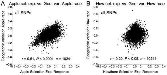 Relationships of the genomic responses of SNPs in the prewinter selection experiments (allele frequency difference between treatments, 7–32 days) vs. geographic variation between the Grant, MI and Urbana, IL sites (allele frequency difference between sites, Grant—Urbana) within the host races for all 10,241 SNPs genotyped in the study. (A) Apple selection experiment vs. geographic variation within the apple race; (B) hawthorn selection experiment vs. geographic variation within the hawthorn race.