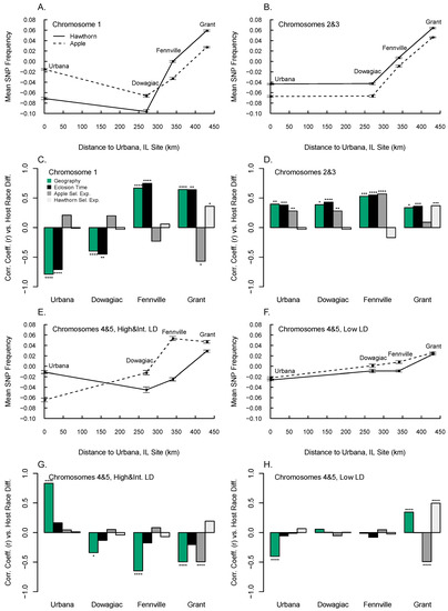 The low LD SNPs on chromosomes 4 and 5 generally showed the least geographic variation, host-associated divergence, and differences in eclosion time (Figure 4F,H; Table 1 and Table S3). As a result, eclosion time did not significantly account for host differences for low LD SNPs on chromosomes 4 and 5 at any of the four pairs of apple and hawthorn fly sites (Figure 4H). However, the hawthorn and apple selection experiments did significantly explain host divergence for low LD SNPs on chromosomes 4 and 5 at Grant, being significantly positively related for the hawthorn selection experiment and negatively related for the apple selection experiment. In addition, geographic variation within the hawthorn host race was negatively correlated with host differences at Urbana, but positively correlated with host differences at Grant.
