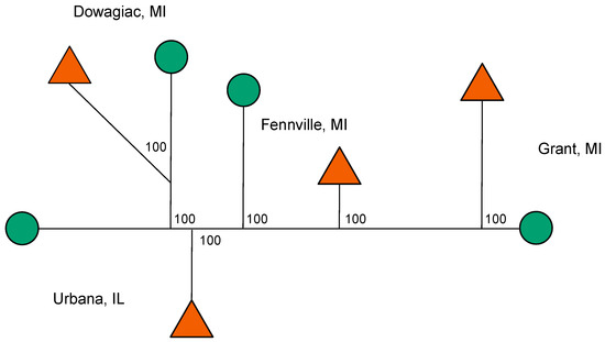 The recent shift of R. pomonella from its ancestral host downy hawthorn (Crataegus mollis) to introduced domesticated apple (Malus domestica) in the mid-1800s is an example of ecological divergence-with-gene-flow, hypothesized to also represent speciation in action [31,32,33]. Variation in diapause life history timing adapting apple and hawthorn flies to a seasonal difference in the fruiting times of apple vs. hawthorn trees have been shown to be important in generating partial ecologically based RI between the fly “host races” [34,35]. Thus, the apple and hawthorn host races are hypothesized to represent an early stage of differentiation, only partly sorted by divergent selection along the ecological speciation continuum into distinct taxa due to the homogenizing effects of gene flow. In this regard, mark-release-recapture studies have estimated that inter-host migration between sympatric apple- and hawthorn-infesting fly populations occurs at a rate of ~4% per generation [35] and there is no detectable intrinsic RI between the races [36]. Thus, directional selection and drift in geographically and reproductively isolated demes [37,38], rather than divergent selection in the face of gene flow, can be discounted as causes for host-related divergence. The host races therefore can be thought of as constituting a primary hybrid zone of recent historical origin distributed across a spatial mosaic of apple and hawthorn trees interspersed across the landscape.