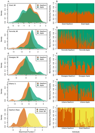 Discriminant Analysis of Principal Components (DAPC) discriminant function plots (panels A,C,E,G,I) and assignment probabilities (panels B,D,F,H,J) for individual flies analyzed for k = 2 predesignated populations of: (A,B) apple and hawthorn flies from Grant, MI (number of Principal Components [PC] as determined by a-scores = 1; mean assignment probability to correct population = 0.510 ± 0.007 s.e.; p = 0.183 for significant genetic clustering, as determined by Monte Carlo simulation); (C,D) apple and hawthorn flies from Fennville, MI (number of PCs = 5; mean assignment probability = 0.642 ± 0.016 s.e.; p ≤ 0.001); (E,F) apple and hawthorn flies from Dowagiac, MI (number of PCs = 4; mean assignment probability = 0.565 ± 0.021 s.e.; p = 0.089); (G,H) apple and hawthorn flies from Urbana, IL (number of PCs = 8; mean assignment probability = 0.633 ± 0.022 s.e.; p = 0.001); and (I,J) hawthorn flies from Grant, MI and hawthorn flies from Urbana, IL (number of PCs = 14; mean assignment probability = 0.886 ± 0.018 s.e.; p ≤ 0.001).