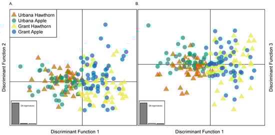 Discriminant analysis (DAPC) of apple and hawthorn populations from Grant and Urbana (Figure 7) qualified the relative scale of local host-related versus geographic variation and the lack of global geographic clustering for the races. Discriminant function 1, which accounted for 93.4% of the genetic variation explained by the PCs retained in the analysis, principally separated the Grant and Urbana sites geographically from one another (Figure 6A,B). In comparison, discriminant function 2 (3.85% of the genetic variation) and discriminant function 3 (2.75% of the genetic variation) very modestly distinguished the host races from each other locally at the Grant (Figure 7A) and Urbana (Figure 7B) sites, respectively.