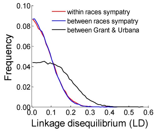 We calculated composite LD values for unlinked loci according to Weir [68] to examine the extent to which selection acts on the genome as a unit to differentiate apple and hawthorn flies. To assess this, we calculated LD between SNPs mapping to different chromosomes: (1) within local apple and hawthorn fly populations at the four sympatric sites; (2) between the host races based on pooled apple and hawthorn fly populations at the four sympatric sites; and (3) between hawthorn fly populations at Grant and Urbana. We restricted our analysis to SNPs (n = 524) displaying significant responses in the eclosion time GWAS and/or prewinter selection experiments, and that showed a genetic response (allele frequency difference) of at least 0.2 in one of the three studies (i.e., loci likely to be under strong diapause-related selection). These comparisons allowed us to examine whether and the extent to which selection has acted in a concerted manner across the genome between host plants and across geography to elevate LD among unlinked SNPs above baseline levels within the races, a key metric of progress towards coupling/speciation.