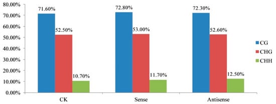 The methylation levels of different samples. The methylation levels of CK (control), sense, and antisense tomato fruit were analyzed, the CG type showed the greatest level of methylation, from 71.6 to 72.8%, followed by CHG type with 52.5 to 53%, and then CHH type with 10.7 to 12.5%.