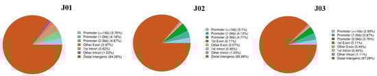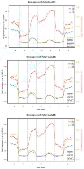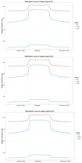 The methylation levels of the repeat regions of different samples. The CG, CHG, and CHH types were first raised and decreased in the downstream region and the methylation levels of the CG and CHG type were considerably higher than the CHH type in the CK (J01), sense (J02), and antisense samples (J03).