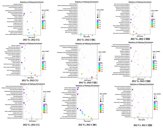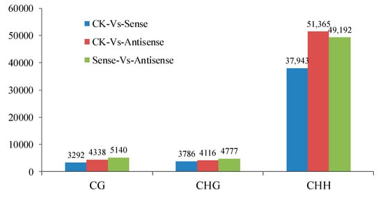 The differentially methylated regions (DMRs) of the different methylation types in different samples. Numerous DMRs were detected in the three comparative groups—3292, 4338, and 5140 DMRs were found in the CG methylation type; and 3786; 4116; and 4777 DMRs and 37,943; 51,365; and 49,192 DMRs were found in the CHG and CHH methylation types, respectively.
