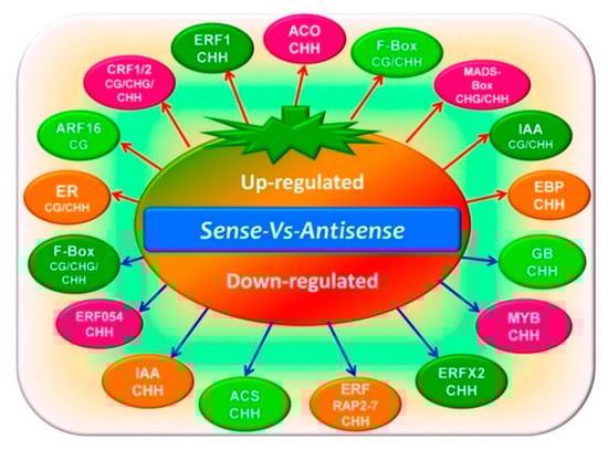 Compared with the GO results, the KEGG results showed more differences between the three methylation types (CG, CHG, and CHH) and the separate comparable groups (CK_vs_Sense, CK_vs_Antisense, and Sense_vs_Antisense). For the CG methylation type, the methylated genes were found to be involved in several different pathways such as carbon metabolism and starch and sucrose metabolism. Intriguingly, in the DMR and DEG conjoint analysis, particularly in the Sense_vs_Antisense group, several genes were found to be involved in the ethylene synthesis and signaling pathway (such as ACS, ACO, MADS-Box, ER, ERFs, and F-box). In addition, the genes involved in other hormone and transcription factors (IAA, GB, ARF, and MYB) were also found, which indicates the potential significant roles of DNA methylation in the ethylene pathway (Figure 8, Table S6).