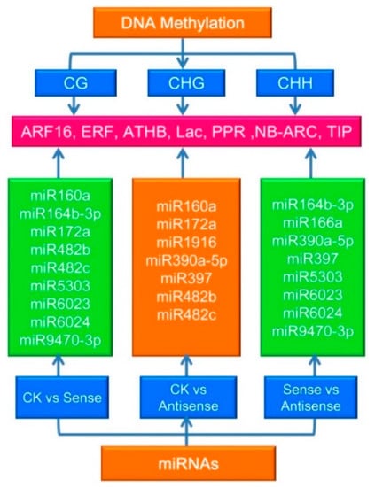 MicroRNAs play vital roles in plant development and fruit ripening and senescence. Previous studies have paid more attention to the gene-repression mediated by miRNAs. In this work, the relationship between the DNA methylation pattern and levels of miRNA target genes was deciphered and191 target genes with different levels of methylation were found. The DEGs of the miRNAs between CK_vs_Sense, CK_vs_Antisense, and Sense_vs_Antisense groups were analyzed and the targets of the DEG miRNAs were analyzed. Among the CK_vs_Sense, CK_vs_Antisense, and Sense_vs_Antisense samples, 9, 7, and 8 different expressed miRNAs were found, respectively. The target genes were involved in ARF16, ERF, ATHB, Lac, PPR, NB-ARC, and TIP (Figure 9, Table S7).
