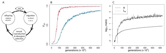 Forward-time simulations with (A) life-cycle diagram for the simulation model used, (B) population differentiation (fixation index, ) over time for neutral (blue) and selected (red) sites, and (C) coupling measures for single simulation run. In (B,C), and . The Methods section provides definitions of the coupling coefficient, , and the effective number of loci, .