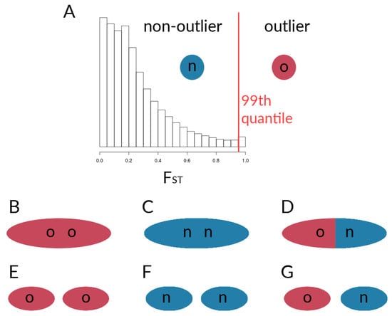 Schematic of comparisons for the calculation of correlation coefficients between sets of loci within species. (A) Designation of outlier loci based on , which was used for the calculation of for (B) outlier loci within the given chromosome, (C) non-outlier loci within the given chromosome, and (D) outlier loci with non-outlier loci within the given chromosome. Further, values werecalculated for sets of loci on the given chromosome with respective sets sampled from all other chromosomes, with (E) outlier loci vs. outliers from other chromosomes, (F) non-outlier loci vs. non-outliers from other chromosomes, and (G) outlier loci vs. non-outliers from other chromosomes.