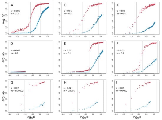 Neutral sites began to show signs of differentiation for , regardless of the values of s and m (note where blue points begin to rise from zero in all panels of Figure 4 except Figure 4D). They reached their maximum rate of differentiation for values of (note the positions of the right-most vertical lines in Figure 4; there is no line shown for neutral sites in Panel C because it was off the scale; see Table S2 for exact values). Intuitively, selected sites showed signs of differentiation for lower values of compared with the neutral sites (note the red points above the blue points in Figure 4). Strong acceleration of differentiation indicates the occurrence of coupling among selected sites. The point of the maximum rate of change for selected sites as a function of depended strongly upon migration, m, and much less so upon s. When , this point occurred for (=0.22; see Table S2) regardless of s (Figure 4A–C). When m was increased, this point increased as well, to , which again varied little with a two-fold change in s (Figure 4E,F). To summarize, there was a general association between how difficult it is for selected sites to differentiate and how similar the dynamics are for selected versus neutral sites, but there was no singular value of for which all scenarios showed transitions of either selected or neutral sites.