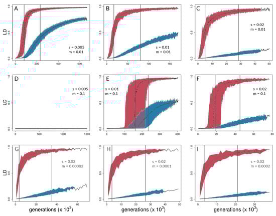 Time series of between-deme linkage disequilibrium (LD) for the same combinations of s and m as in Figure 4. Each plot (A – I) shows the median LD values across 50 independent simulation runs and 95% quantiles (for simulation medians) for selected (red) and neutral sites (blue). Grey lines indicate the point of highest slope by nonlinear least squares model fitting for medians across the 50 respective runs (Table S3 for details).