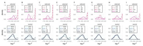Density curves of within-deme LD as for representative generations of bu2s runs (corresponding to Runs A,B,C,E,F,G,H, and I in Figure 4 and Figure 5), where (A) , , (B) , , (C) , , (E) , , (F) , , (G) , , (H) , , and (I) , . Numbers in legends () show the number of generations elapsed for respective lines and colors. Times vary from panel to panel because of the differing numbers of generations required for divergence with different parameters. In each case, the times chosen represent early, early-middle, late-middle, and late stages of divergence.