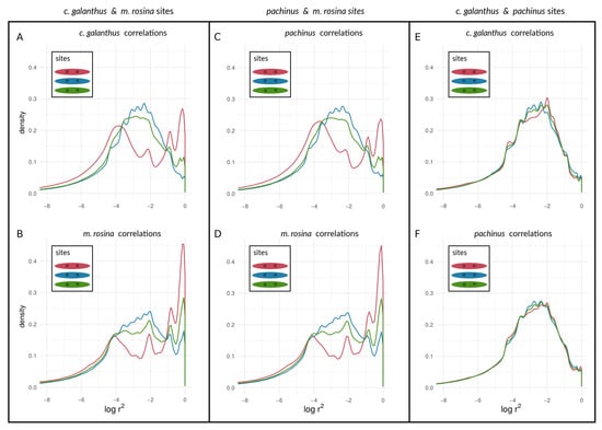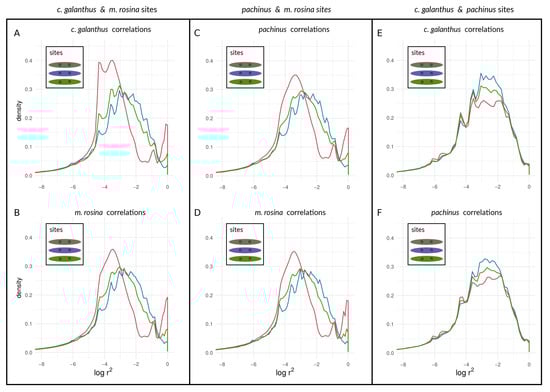 Turning towards the coupling of respective sites with sites on other chromosomes, we found that both species pairs involving H. m. rosina showed evidence of coupling of outliers with outliers from other chromosomes—i.e., high values of —both for autosomes (Figure S5A–D for Chromosome 2; see also Figures S6–S8) as well as for the Z chromosome (Figure S9A–D). Similarly to the coupling within chromosomes, the c. galanthus–pachinus pair did not exhibit signs of coupling (Figures S5–S9E,F) with pairs of loci from other chromosomes. In plain terms, when a second, upper mode appears in a distribution of correlation coefficients, as seen in Cells A and B of Figure 7 and Figure 8 (see also Figures S2–S9), this is indicative of the occurrence of non-random associations between large numbers of sites. That is, the appearance of a second, upper mode indicates that a transition has occurred in which at least some portion of sites in the genome are statistically non-independent and thus coupled with each other. This is qualitatively different from seeing a (hypothetical) gradual shift in the mean and mode of a unimodal distribution. The system—and more specifically, coupled portions of the genome—has qualitatively shifted in its dynamics; a marked portion of the genome is now evolving as a coupled unit. This suggests that inversions and structural features are not the only reason for elevated LD between pairs of loci within species.