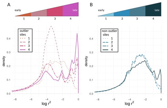 It should be noted that, with the sample sizes of numbers of outliers, there are thousands of sites near a given mode. Different types of sites (outliers vs. non-outliers), different chromosomes within a taxonomic comparison, and different taxonomic comparisons all show variation in the presence/absence and (if present) prominence of the upper mode of the distribution. We can hypothesize that this variation may indicate how different taxa and different portions of the genome are at different points along the speciation continuum. Under this hypothesis, these different points are proxies for changes in time, as Figure 9 attempts to illustrate. Moving from the curves in sequence from “1” to “4” in Figure 9A, we see increasing levels of coupling among outlier loci. Looking at the same comparisons for non-outlier sites in Figure 9B, we see the lag of non-outlier sites behind outlier sites, but that the non-outlier sites do eventually begin to show signs of being coupled as well, as evidenced by increased within-deme LD. Results based on AFD quantiles were very similar to outliers (see Figures S10–S19 for all species pairs and respective chromosomes).