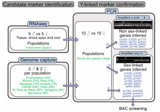 Our approach is summarized in Figure 1. We used male-specific gene expression [32] and male-specific genome sequences from a large sample of males and females of M. annua, sampled from across the species’ range [31], to identify potential Y-linked markers. We verified the Y-linked status of these markers by male-specific PCR amplification and used Sanger sequencing to verify that the amplified sequences were similar to the expected transcripts. We then used PCR reactions to probe a BAC library constructed from two diploid M. annua males, collected near Lausanne in Switzerland. Finally, we used long-read (Pacific Biosciences, Menlo Park, CA, USA) sequencing to assemble contigs of the identified Y-linked BAC sequences for subsequent analysis of content and genomic structure.