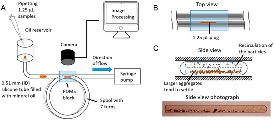 The tube was coiled around a spool in turns of 30 cm to be able to store it compactly. A digital camera (5D Mark II) (Canon, Tokyo, Japan) with a macro lens (MP-E 65 mm 1–5× macro) (Canon) was positioned above the spool to be able to observe the passage of the assays at regular intervals. A PDMS block was cast around the tubes to minimize the optical effect of the silicone tube walls by refractive index matching, effectively creating an observation window that encompasses seven turns of the spool (Figure 1B). A white LED lamp was placed underneath this window to provide uniform and repeatable lighting.