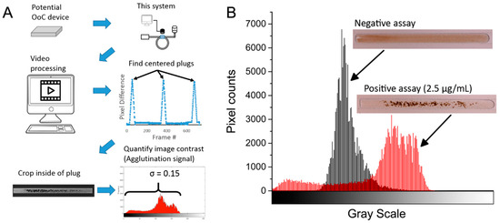 (A) Example of plug quantification and workflow. The image processing algorithm detects changes in the field of view of a video and identifies the frame containing a complete and centered image of a plug. A region of interest of the interior of the plug is cropped, and the standard deviation of its grayscale values is obtained. (B) Example histograms of a negative (microbeads + simple bovine serum albumin (BSA)) and a positive test (microbeads + biotinylated BSA, 2.5 µg/mL in the example shown). In a negative test, the uniform suspension of microbeads is seen as a low contrast region with a narrow grayscale distribution. Conversely, a positive test will have dark aggregates of microbeads, resulting in higher contrast and a wider histogram. OoC:Organ-on-Chip; σ: standard deviation.