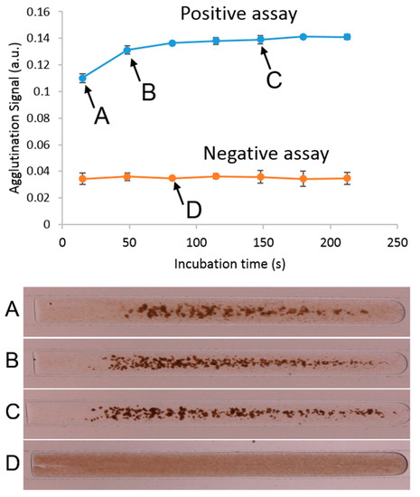 We monitored the progression of the assay as it travelled through the system to ensure incubation reached a steady state [74]. Reaching equilibrium, or a steady state, is desirable, as this gives the assay more stability even when having small differences in conditions between tests [75,76]. Figure 3 shows an example of a single experiment, using an analyte concentration of 2.5 µg/mL at a speed of 175 µL/min. As seen in the photographs, the assay progressively forms aggregates that are visible as areas of higher contrast (Figure 3A–C). We plot this agglutination signal as a function of incubation time and observe an increase in the signal until the fifth window (approximately 150 s). At this point, the agglutination begins to show saturation, indicating that sufficient incubation has occurred and that the tube is of sufficient length to complete the assay. It can also be seen that a negative test, consisting of only BSA, will not show any change as the droplet travels through the windows, as no agglutination is taking place, and remains as an even dispersion of microbeads (Figure 3D).