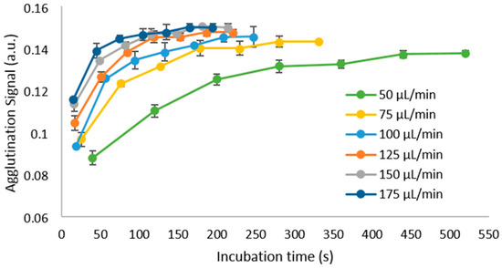 Reaching equilibrium, or a steady state, is desirable as this gives the assay more stability even when having small differences in conditions between tests [75,76]. At 50 µL/min, the mixing rate will be lowest, which results in a lower magnitude of the measured agglutination signal, while simultaneously taking more time to reach a steady state. Increasing flow rate shortens the time required to saturate the agglutination signal, reaching a maximum at 175 µL/min. We also found that at flow rates higher than the ones shown, the final agglutination signal begins to decrease, as the higher shear forces within the plug can overcome the binding forces of the assay and begin to separate the aggregates of beads.