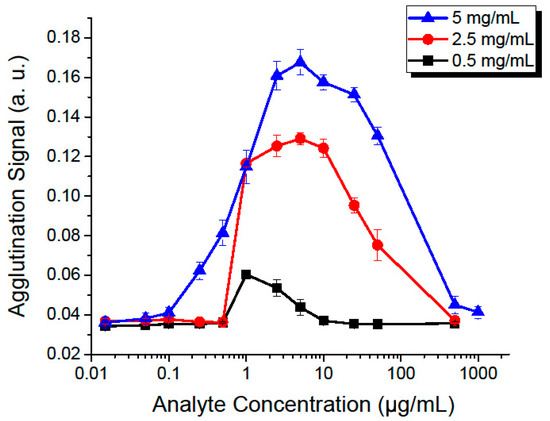 As concentrations increase, we measure a higher agglutination signal until it reaches a maximum and then begins to decrease. This phenomenon is known as the prozone or Hook effect [11,81], a false-negative that is caused by saturating the microbeads with the analyte. If all sites of two neighboring microbeads are saturated, then they will be unable to bind to each other, effectively reducing the degree of agglutination. The prozone effect appears at higher analyte concentrations when the microbead concentration is increased. This is to be expected, as the higher microbead count requires more analyte molecules to saturate. A serial dilution can be performed to allow measurements that would be unmeasurable otherwise, thus extending the usable range of the test.